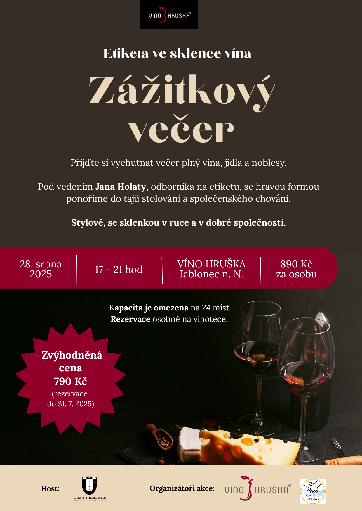 Jsem nesmírně vděčná za to, že se akce může uskutečnit právě ve vinotéce Víno Hruška v Jablonci nad Nisou, která má nejen kouzelné prostředí, ale i skvělého pana majitele, Petra Bušanského. Jeho vstřícnost, energie a podpora pro mě znamenají opravdu mnoho. Stejně tak si velmi vážím účasti výjimečného lektora Jana Holaty, jehož zkušenosti, humor a schopnost nadchnout lidi jsou zárukou, že si večer užijete naplno.